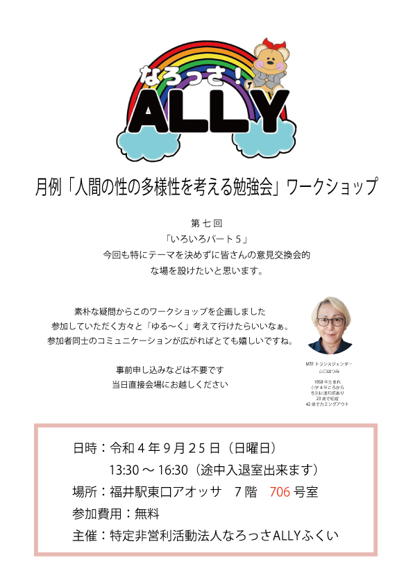 「なろっさ ALLY ふくい」は福井でLGBTQ+を含む性的マイノリティに関するイベント、勉強会(ワークショップ)を開催しています。当事者やALLYの輪をひろげたいとの想いから活動している特定非営利活動法人です。